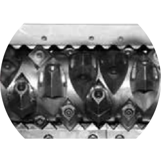此刀輥是針對ABS.PC.尼龍等堅(jiān)硬材料進(jìn)行特殊設(shè)計(jì)。刀具沉入較深,單次切料較少,減少?zèng)_擊,同時(shí)降低噪音。